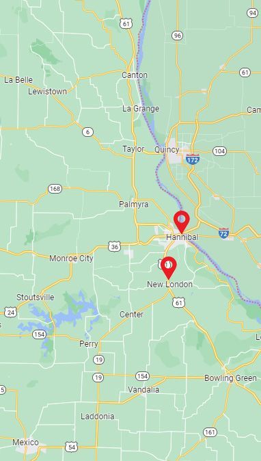 New London is located just 7 miles South of Hannibal. The County Seat of Ralls County, New London is home to just under 1000 people. Platted in 1819, New London is the home to the Ralls County Courthouse, which was completed in 1859. New London is a great small town with several restaurants, a full grocery store, and other shops for your immediate needs with Hannibal a few minute drive away.